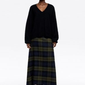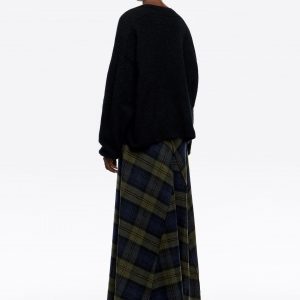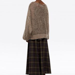 Dark Khaki Checked Wool A-Line Midi Skirt