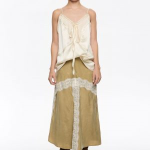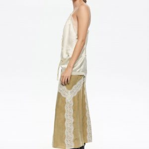 Light Khaki Contrast Lace A-Line Midi Skirt