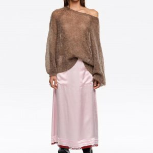 Pink A-Line Midi Skirt with Lace Hem