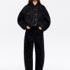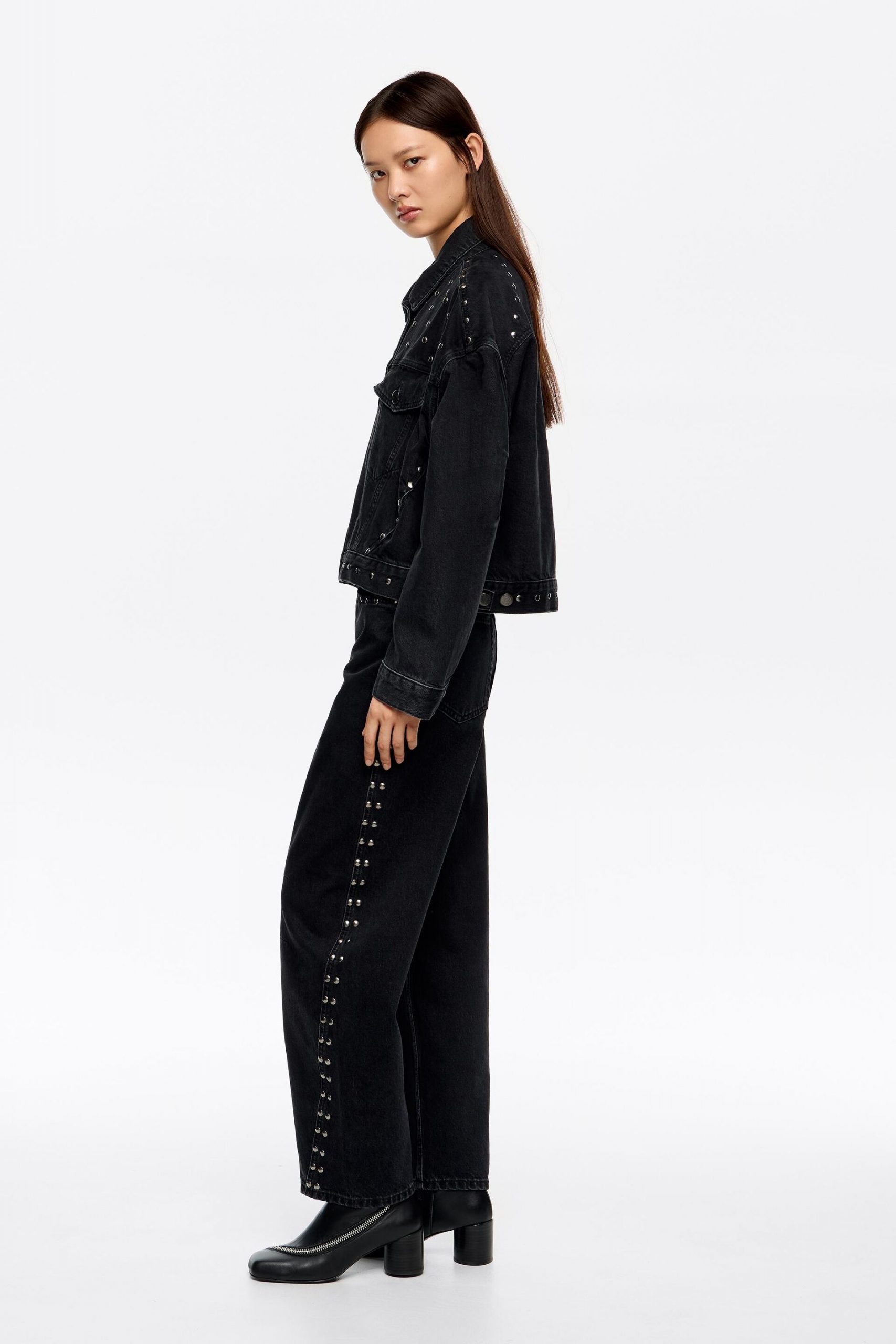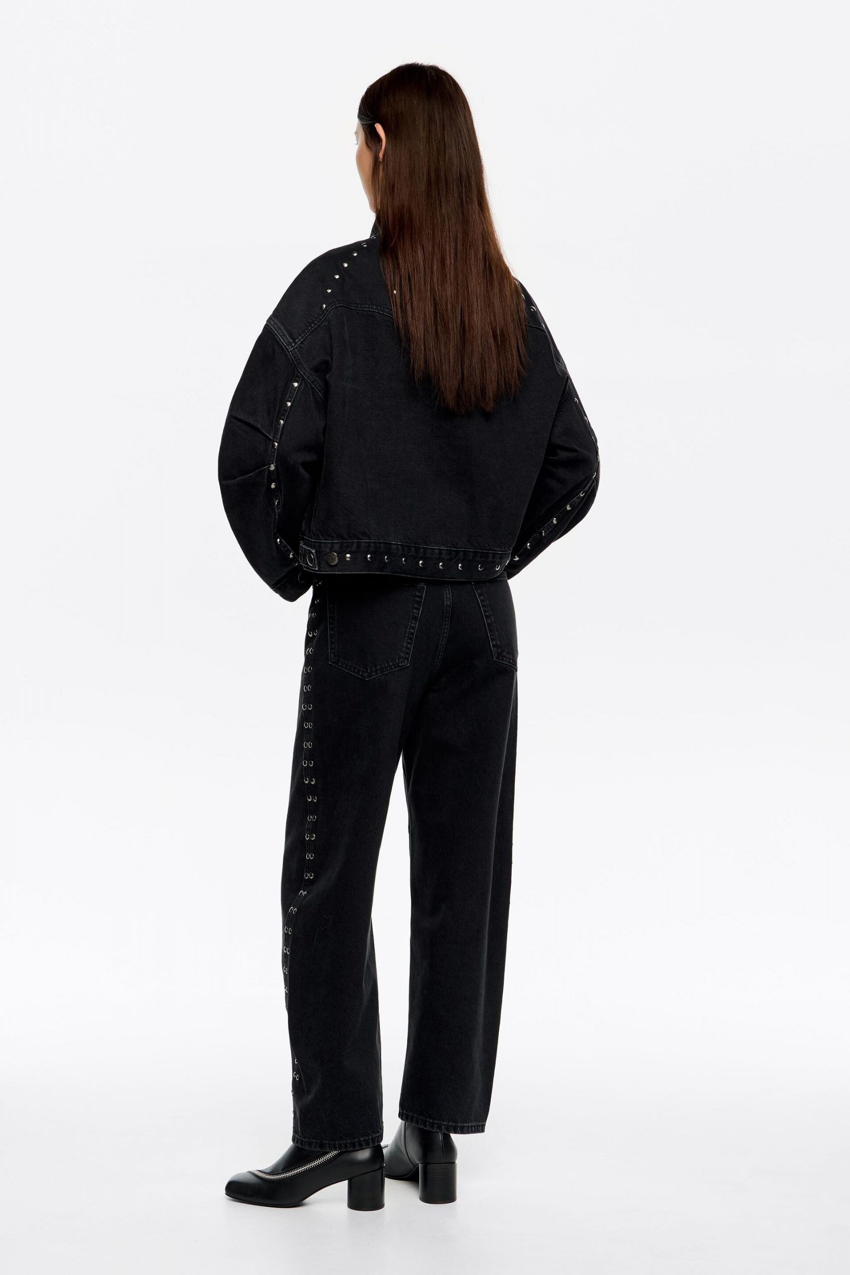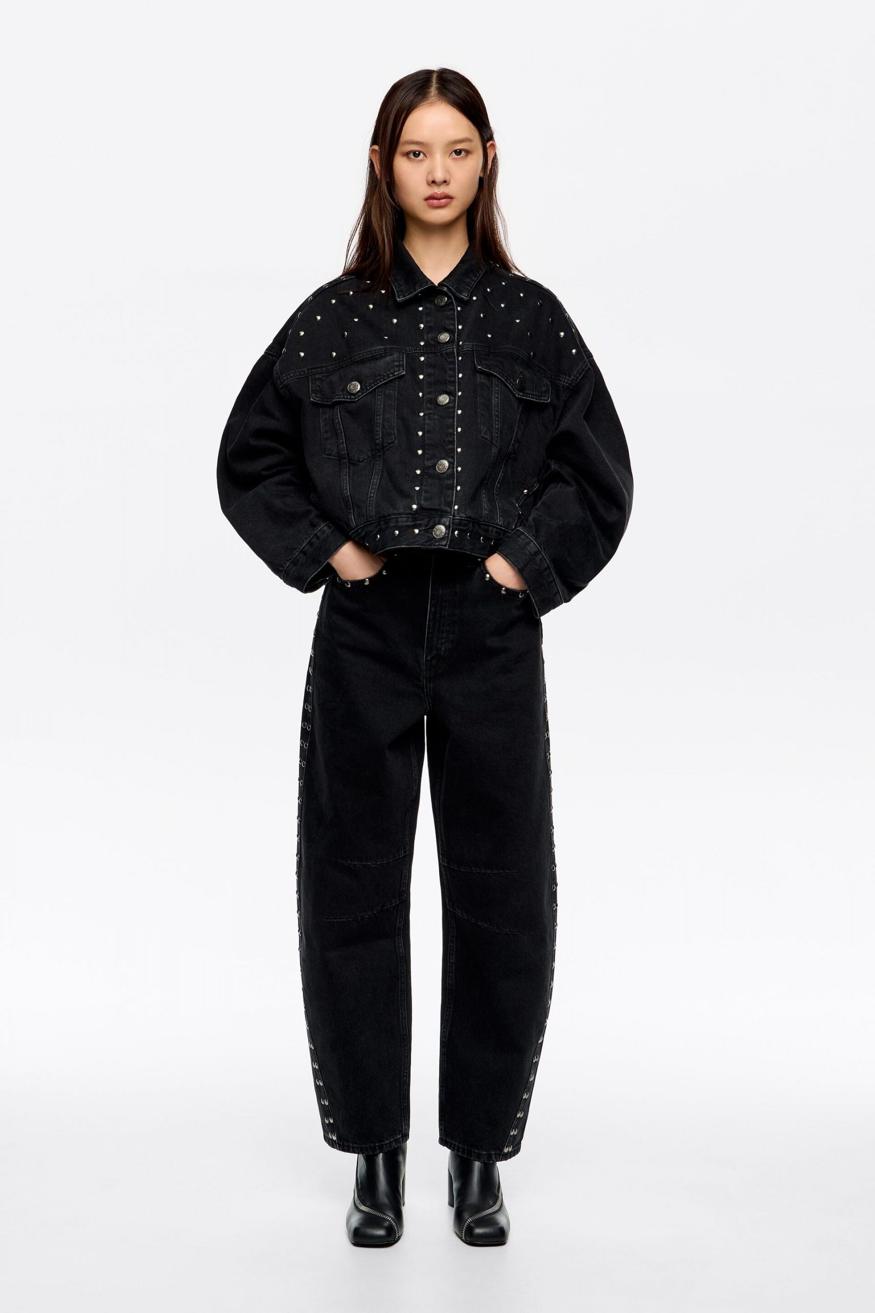 These black studded barrel denim trousers make a bold statement with their asymmetric seams and all-over metal stud detailing. Made from 100% cotton with 20% recycled fibers, they offer structure while maintaining comfort. The mid-rise waist, ankle-length cut, and functional five pockets further refine the silhouette, while the front button-and-zip closure completes this striking look.