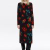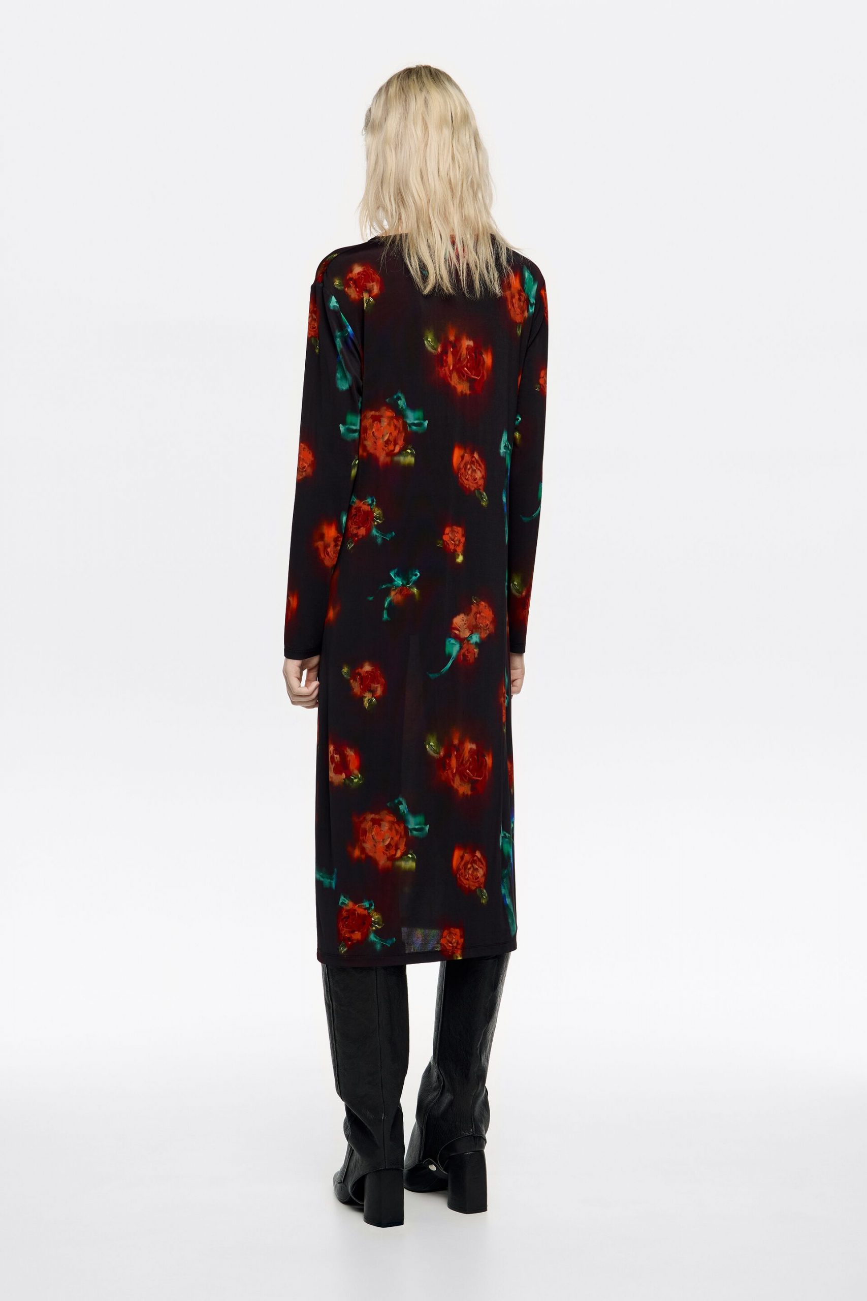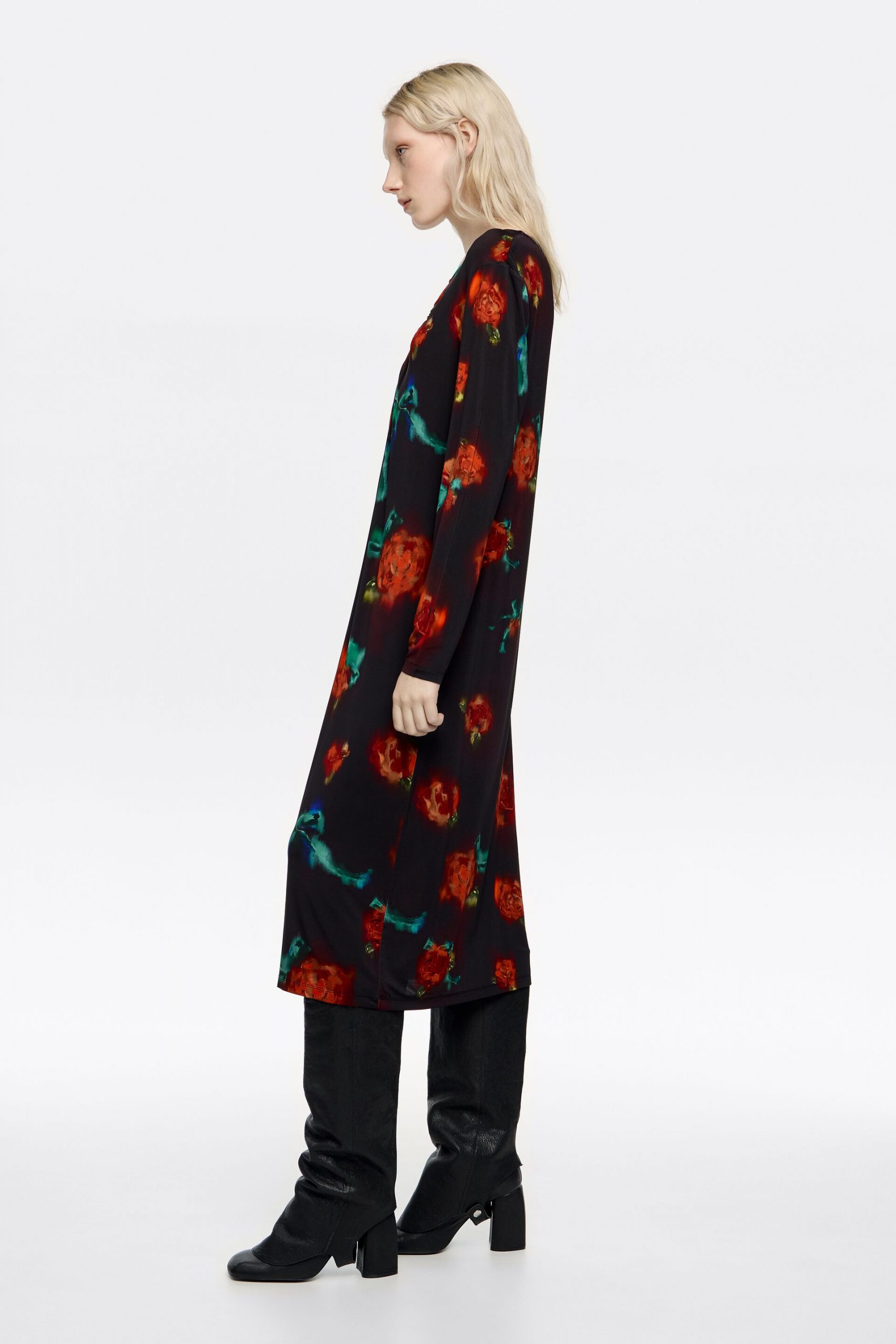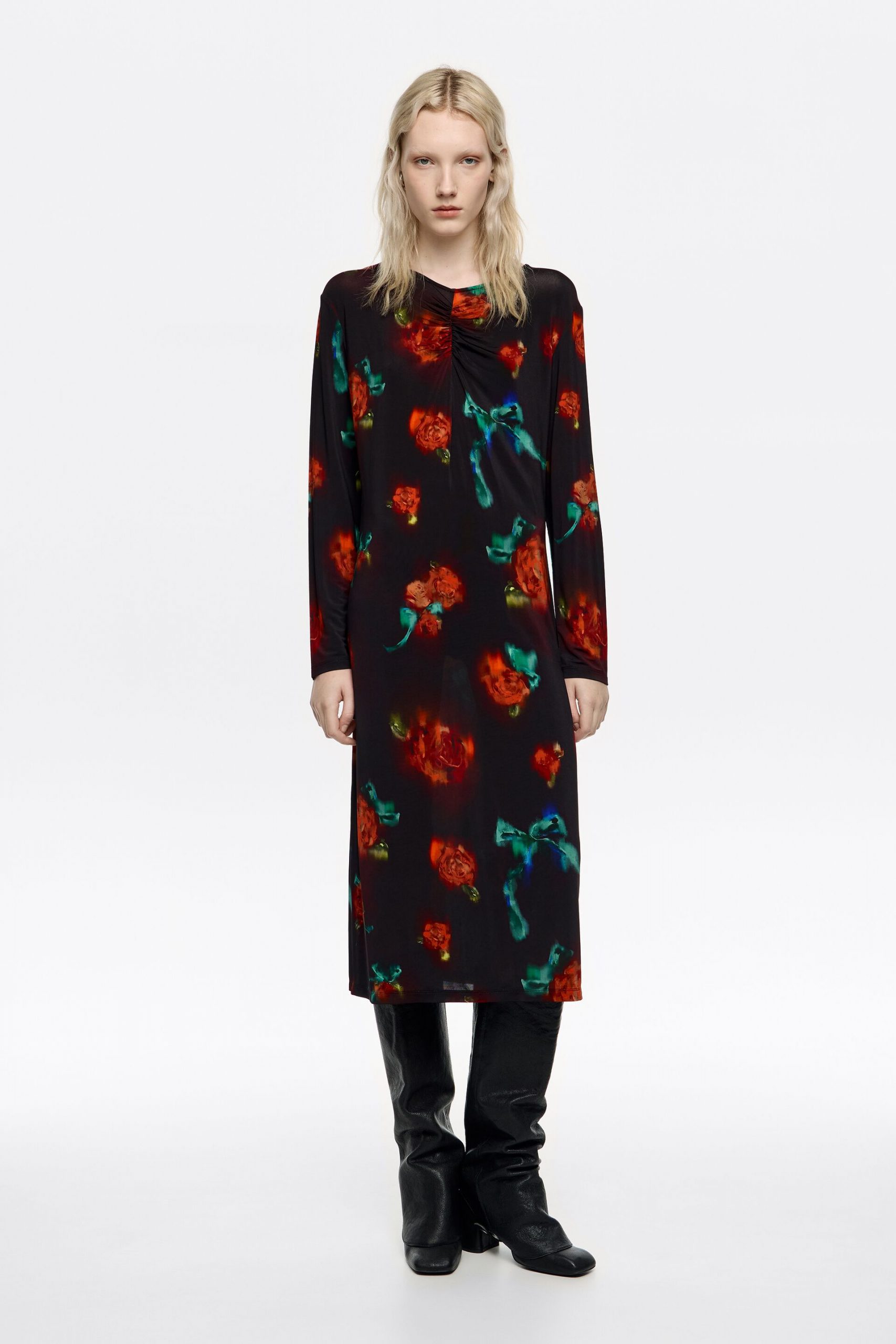 This black Ribbon Roses midi dress combines a straight-cut silhouette with a softly ruched V-neckline that enhances shape. Long fitted sleeves balance the design with a sleek finish. Elegant and versatile, it works beautifully for both evening wear and elevated daytime styling.